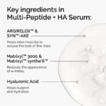 Multi-Peptide + HA Serum is a comprehensive, age-supporting formulation that combines multiple technologies to help address common signs of early skin aging, including the look of fine lines and the feel of skin elasticity and firmness. By utilizing four well-studied peptide technologies—SYN™-AKE, Matrixyl™ synthe’6™, Matrixyl™ 3000, and ARGIRELOX™— alongside amino acids, and multiple hyaluronic acid complexes, this multi peptide serum reduces the appearance of crow’s feet, improves skin elasticity and enhances firmness.